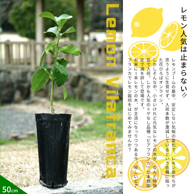 年々盛り上がりを増す「家庭果樹栽培」ですが、その先駆けともいえる品種といったら「レモンの木」!レモンは1株で様々な楽しみかたがあり、収穫までの間も 皆さんを退屈させません!そして、やはりレモンのなかでも人気があるのが、「トゲなし」もレモンの木。今回ご用意したビアフランカが、性質上トゲが小さくて少ない、「トゲなしレモン」です。当店でも、レモンのなかでは入荷本数が少ない、珍しいレモンの木です。滅多に入荷のない「ビアフランカ」が今回まさかの特価苗で、しかも送料無料でお届け!
