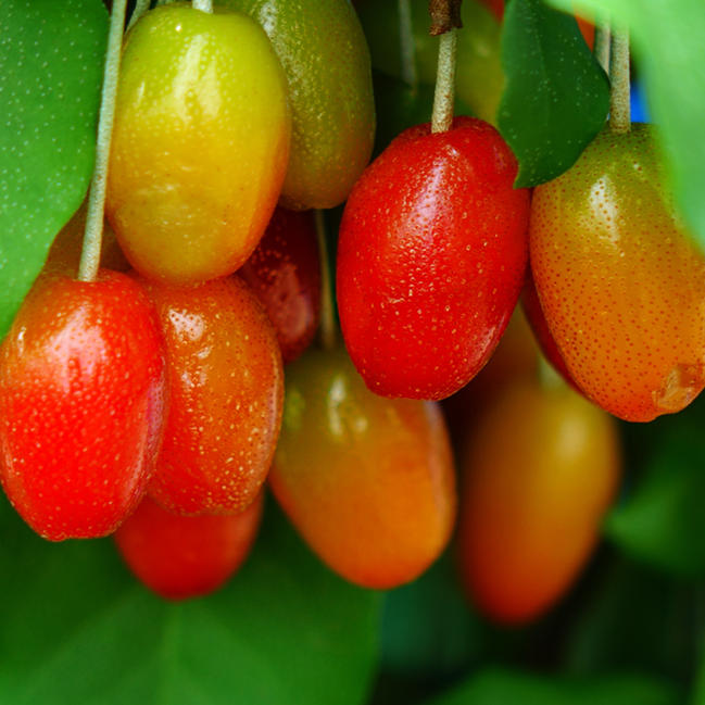 グミの中では大果。作りやすい品種です。甘い実が鈴なりになり、鮮赤色に完熟すると、果肉もやわらかく、多汁になり、とろけるように甘くなります。果実は生食したり、グミ酒にします。