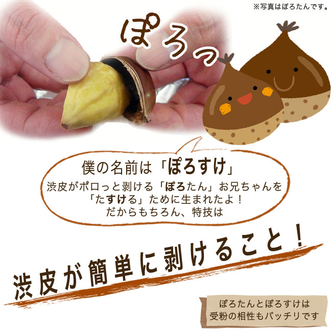 渋皮が簡単に剥けるニホングリのさらなる拡大を目指し、期待の新人としてぽろたんに次いで登場したのがこのぽろすけ。