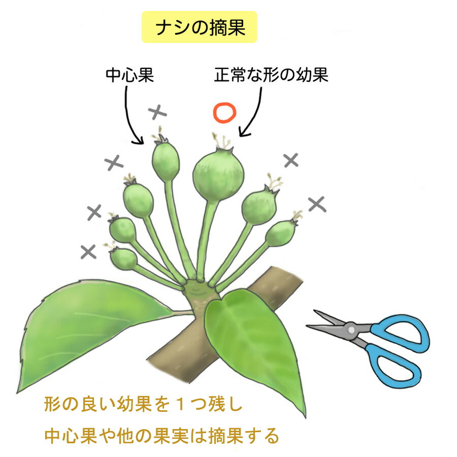 開花後の摘果を怠ると果実の肥大が進まず果実が小さくなります。ナシは1つの花芽から7~8輪の花(1花そうと呼びます)が咲きますが、基部から3~4番目に咲く花が一番果実が肥大しやすいです。