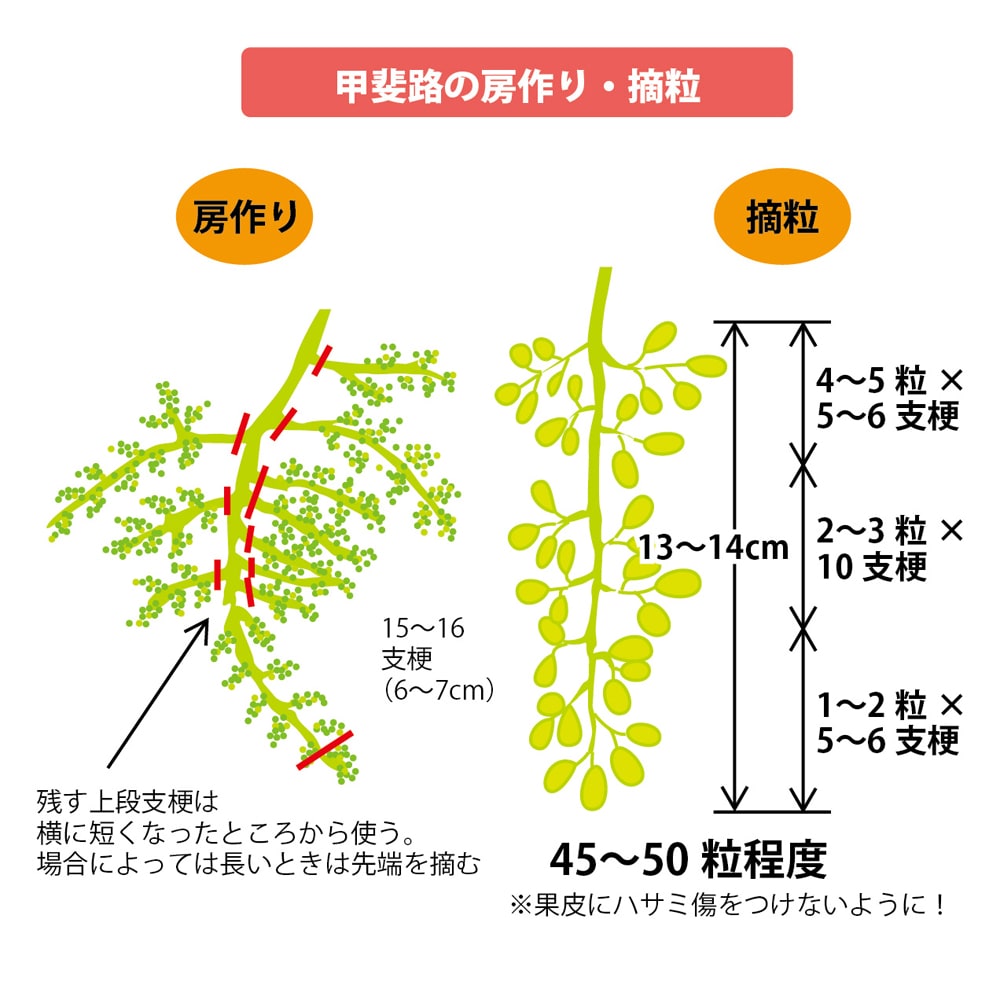 1本の新梢に2~4個花房ができますが、全部ならせると着色不良や果実の肥大も遅れ、来年の花芽も充実しなくなるので、棚仕立てでは50cm前後の弱い枝は新梢3本に1房、1mくらいの枝では2本に1房、2mの強い枝には1房を目安に摘房します。フェンス仕立てでは縦に伸ばすツル1本に1房。ならせなかった枝は翌年の着枝にします。