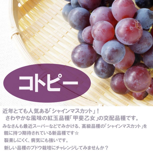 他の画像を見る さっぱりした甘さの病気に強い赤ぶどう 【コトピー】 ぶどう 1年生接木苗 ウィルスフリー 登録品種・品種登録 ¥ 5,998 税込 売り切れ 再入荷お知らせ お気に入りに登録する (0)