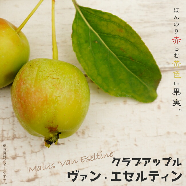 ヴァン エセルテイン(ファン エセルティン Van Eseltine)は、ほんのり赤く色づく、黄色い果実のクラブアップルです。枝が横に伸びずに上へ上へと伸びるので、ほうき状または円柱状の樹形になります。葉張りがでないので、限られたスペースでも安心して育てられます。