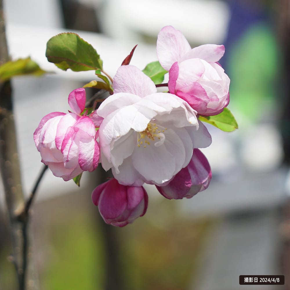 4月ごろには、半八重咲きでのピンク色の花を咲かせます。濃い紅色の蕾から優しいピンク、そして白色へと変化を楽しむことができます。