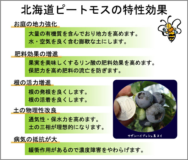 北海道ピートモスは、通常のピートモスに比べて長繊維、毛足が長く粒が不揃いで繊維状の有機質がしっかりしています。だから、庭土の土圧に負けず、植物の根張りを守ってくれます。 さらに、数千年にわたって植物が堆積し分解された北海道の泥炭を採掘し、乾燥・粉砕した北海道ピートモスには、植物の生育の障害になるようなタンニン、油脂などの成分は一切含まれていません! あらゆる植物の生育に適している天然土壌改良剤です。