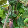 開花期になると、蕾を包んでいる葉が花のように見えますが、その中に花が房状にあります。だんだんと垂れ下がりながら赤紫色に変わり大きな筆先のような形になります。蕾を包んでいる葉が1枚めくれ上がるたびに、1段の花が咲いてやがて1房のバナナになります。
