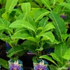パッションフルーツの仲間であるミズレモンです。名前にレモンとついていますが、一般的な柑橘のレモンとは全く異なります。トケイソウで、独特な花の形状をしており、濃い紫色が特徴です。葉の形状や果実は、一般的なパッションフルーツと若干違います。