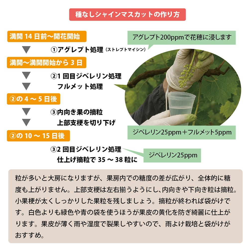 アグレプト処理とジベレリン処理をすることで種無しになります。(ジベレリン処理をしないと種が入ります。)