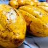 「カカオ」は言わずと知れたチョコレートやココアの原材料となる果実です。太い枝の幹から直接花がつき、とっても不思議な雰囲気です。咲いた花に実がつくのは全体の1%程度だとか・・・。自然界は厳しいですね。実がついている様子はさらに不思議。木から小型のラグビーボールがぶら下がっているような見た目です。品種によって黄色やオレンジ、赤など果皮の色が異なります。フレッシュな果肉は生食することが可能で、とても甘いライチのような味がするそうです。