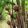 水辺に生えるマングローブ植物のニッパヤシです。ごつい見た目の果実がなり、かたい殻を包丁などで割って中の果肉を食べます。半透明の大きいらっきょうの様な形の、ナタデココの様な果肉を食べます。味はほとんどないので、シロップにつけて、歯ごたえや見た目を楽しむ果物です。