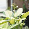 ジェーンは、ハルシオンの枝代わり(芽代わり)で、中型~大型品種です。葉の縁が緑色で葉の中央部分がクリーム色~黄緑・緑色になり、表面に粉をふきます。 日照が強い場所では、中央部はクリーム色になりやすいです。 暗い場所では、葉の縁はより濃く暗い緑色になります。 花色は白~極淡い紫くらいの色です。この品種の交配種に「ジューンフィーバー」、芽代わりに「ジャストジューン」というギボウシがあります。