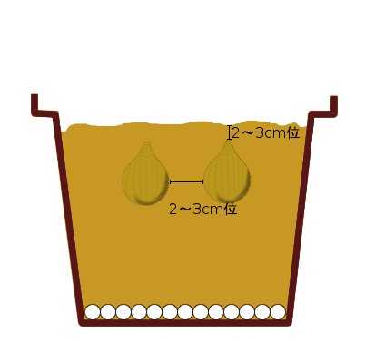 植え付けの間隔は2~3cm位、深さは球根の頭が少し隠れる位に植え付けます。