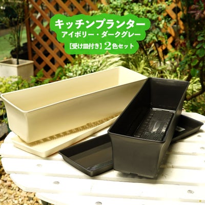 キッチンや窓辺に丁度良い小さめサイズのプランター(受け皿付き)2色のセットです。