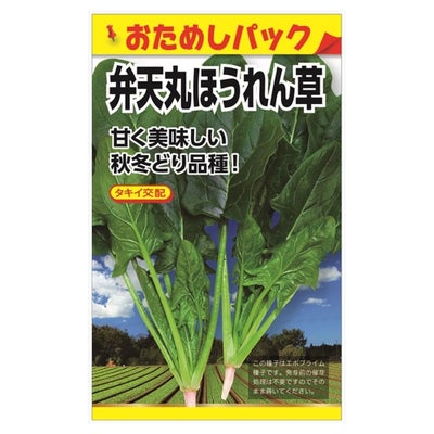 「弁天丸ほうれん草」は、ベト病とレースに抵抗性を持つ秋冬どりのほうれん草。耐病性もあり、草姿が極立性のため収穫しやすく、しなやかで折れにくい、耐寒性も強く葉柄部分の傷みが出にくく、育てやすい品種です。
