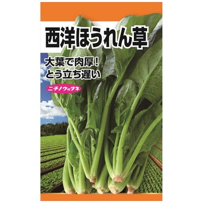 「西洋ほうれん草(大葉)」は、とう立ちしにくい西洋ほうれん草の中でも大葉の形質を持つほうれん草です。「ほうれん草」は、葉を食べる代表的な緑黄色野菜です。とう立ちすると(蕾がつくと)食味が悪くなるため、基本的に冷涼な地域や季節に栽培します。冷え込むことで柔らかくなり、味がより良くなります。種まきから一か月ほどで収穫できるため、初心者にもおすすめの野菜です。葉に切り込みが多く甘みが強いがとう立ちしやすい「東洋種」と、丸葉で灰汁が強い調理向きのとう立ちしにくい「西洋種」、さらにその2系統の「交雑種」に大別されています。