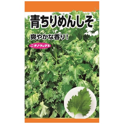 「青ちりめんしそ」は古くから日本で親しまれてきたしそです。名前の通り葉が縮れており、芽紫蘇、葉紫蘇、穂紫蘇として上品な芳香が楽しめます。しそは中国を原産とする芳香性がある一年草です。食用にする葉の色によって、赤ジソと青ジソに分類されます。本来「シソ」は赤ジソを指しており、その変種が青ジソとされています。大葉は青じその別名です。葉は薬味や天ぷらに、花は刺身のつまに、実は塩漬けなど様々な利用方法があります。