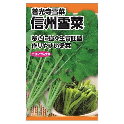 「信州雪菜」はその名の通り、長野県で作付けされている雪菜です。寒さに非常に強く、何回か霜に当ててから収穫します。葉にはきざみがあり、生育旺盛で育てやすく風味があります。「冬菜」とは冬に出回る菜類の総称です。白菜・京菜・唐菜・小松菜などがこれに該当しますが、当店では上記であげた以外のアブラナ科の葉菜野菜をまとめて冬菜としています。秋に種をまき冬に育て収穫が春までの冬菜は、病害虫になりにくいため初心者にもオススメです。