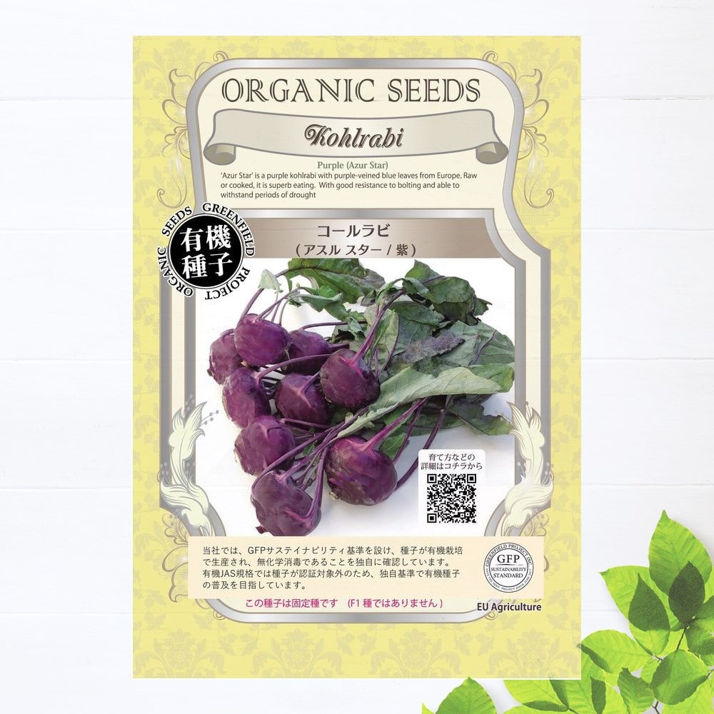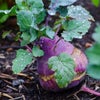 コールラビは、ヨーロッパでは一般的な野菜で、球状に肥大した紫色(中身は薄緑色)の茎部を食べます。プロッコリー茎部に似た風味に甘味が加わった味わいで、生でも炒め物でもシャキシャキとした食感でおいしくいただけます。大変育てやすい品種で家庭菜園にもおすすめの野菜です。