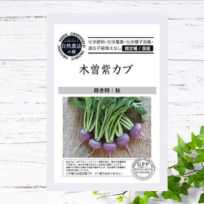 「木曽紫かぶ」は、長野県木曽地方の伝統野菜です。葉は開帳気味に茂り切り込みが深いです。腰高の鮮やかな濃い紫色のかぶで、甘酢漬けにするととても綺麗です。極めて耐寒性、耐雪性に優れ丈夫で育てやすい品種です。「かぶ」は春の七草である「すずな」のことです。アブラナ科の根菜で、肥大した根の部分や葉をいただきます。越冬草で寒さにも強く冬の野菜として重宝します。ヨーロッパ型とアジア型に大別され、さらに大中小で分類されています。アブラナ科には共通して辛みや苦みがありますが、かぶは甘みが強く食べやすいのが魅力です。