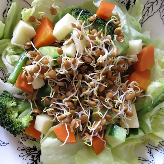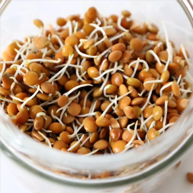 広ロの瓶に種を入れ、種を軽く水洗いし8~12時間水に浸します。その後、1日1~2回、種が乾燥しないように種を水ですすぎ、水を切って栽培します。発芽した種を丸ごと食べます。