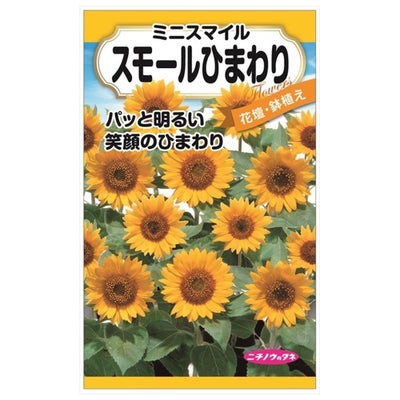 「ミニスマイル」は矮性のひまわりなのでコンパクトに楽しめます。「ひまわり」はキク科の一年草です。大きな花のように見えますが、実際は頭状花序とよばれ、多数の花が集まった花です。キク科の植物は総じてこの形態を持ち、外輪の花びらを「舌状花」、内側の花びらがない部分を「筒状花」と区別しています。長卵形でやや平たい種には、白と黒の縞があり食用とされます。