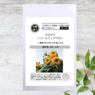 「ゴールディーダブル」は八重咲のひまわりで、一株に5つほどの花がつきます。開花の目安は播種から約90日。花もちもいいので夏の長い間ずっと楽しめます。「ひまわり」はキク科の一年草です。大きな花のように見えますが、実際は頭状花序とよばれ、多数の花が集まった花です。キク科の植物は総じてこの形態を持ち、外輪の花びらを「舌状花」、内側の花びらがない部分を「筒状花」と区別しています。長卵形でやや平たい種には、白と黒の縞があり食用とされます。
