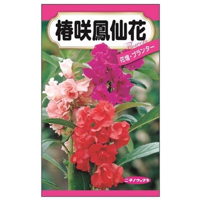 「椿咲鳳仙花」は、椿咲と呼ばれる八重咲の鳳仙花です。「鳳仙花(ホウセンカ)」は、花言葉の「私に触れないで」のように触れると弾ける種が特徴的な植物です。花色は本来の赤に加え、白やピンク、紫、絞りが入ったものなどがあリます。現在主流となっている園芸品種が椿阪と呼ばれる八重咲品種となります。暑さに強く、丈夫で育てやすく、こぼれ種でもよく増えます。