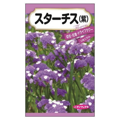 「スターチス(紫)」は紫色のスターチスです。「スターチス」は、鮮やかな紫や黄色の花が印象的で、水分が少ないためドライフラワーに最適な植物です。寒さ・暑さに弱いため育てるには注意が必要です。一年草、宿根草の品種があり、それぞれ性質が異なるためそれぞれの品種にあった管理が必要です。
