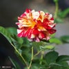 濃い赤と黄色、白の絞り咲き。花が盛り上がって咲くような印象です。花もちも良く、香りも良いです。モスの香り。四季咲き性も強く、繰り返し咲きます。病気にとても強い強健種です。木立性で鉢栽培にもおすすめです。