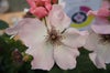 大輪の波打つ薄いピンクの花弁が開くと、赤紫のおしべがひときわ目立って美しい一重咲き品種です。返り咲きする秋の花は特に色が冴えて美しさを増します。