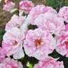 バランゴは、花弁に明るいピンクの絞りが入る中大輪房咲きのバラで、満開時は庭を明るく彩ります。
