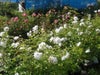 素晴らしい景観をつくるバラでは第一級品。多花性で、純白の八重平咲き中輪咲きの花を繰り返し大きな房状に咲かせます。はらはらと白い花びらを散らす散り際が本当に美しいです。一季咲きに分類されることありますが、返り咲いてくれるので開花期が長く、当店では返り咲きに分類しております。