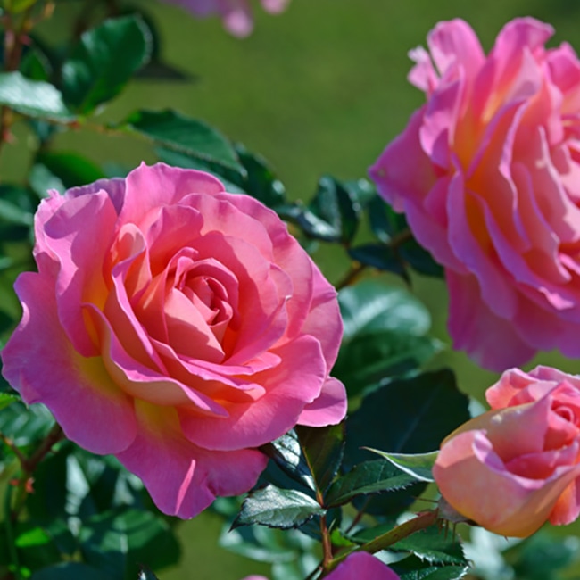 明るいピンクの花弁の裏側に淡い黄色がかる、バイカラー。波うつ花弁が重なり、華やかな花姿が深い緑の葉色によく映えます。コンパクトな樹形で、花壇や鉢植えで育てやすいバラ。春から秋まで繰り返しよく咲きます。ハーブとローズの芳醇な香り。耐病性の強いバラに送られる、ドイツのADR賞など、受賞多数。うどんこ病に強い。