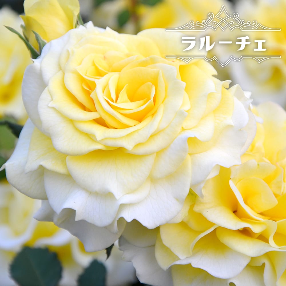 光、輝きを意味する「ラ・ルーチェ」は鮮やかで透き通るようなレモンイエローの波状花弁が美しいバラです。高さ60cm程のコンパクトな木立性で、鉢植え栽培でも地植えでも楽しめます。房咲きでボリュームたっぷり。見る者に元気を与えるビタミンカラーとほのかなティーの香りが特徴です。