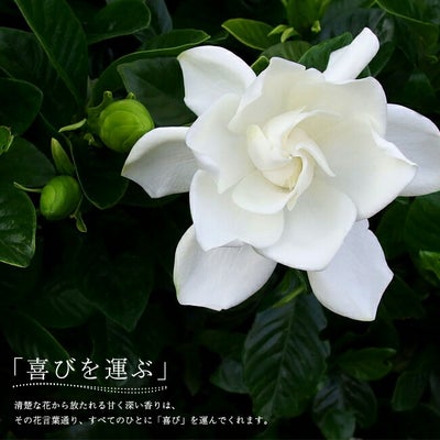 濃厚な香りを放つ香りの女王です。八重咲きは果実がつきません。花の大きさは5~8cmくらいで、開花が進むとうっすらと黄色くなります。常緑低木で、枝はよく分枝し株立状となります。葉は長さ5~11cmの長楕円形で光沢のある深緑色です。