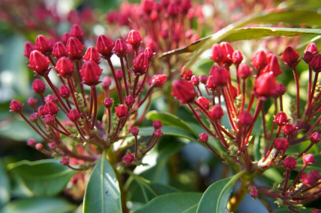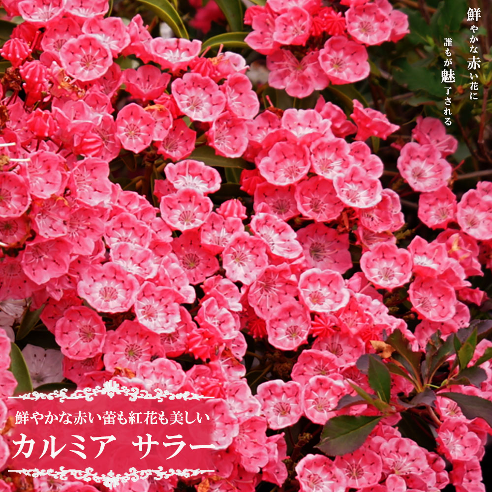 カルミアはコンペイトウのような美しい蕾がかわいい木です。サラーはもっとも鮮やかな赤い蕾が出ます。つぼみが開くとピンク色の皿型の花で、光沢のある葉からひょっこり覗かせてくれます。蕾からかわいいので、開花までと1か月くらい楽しめます。