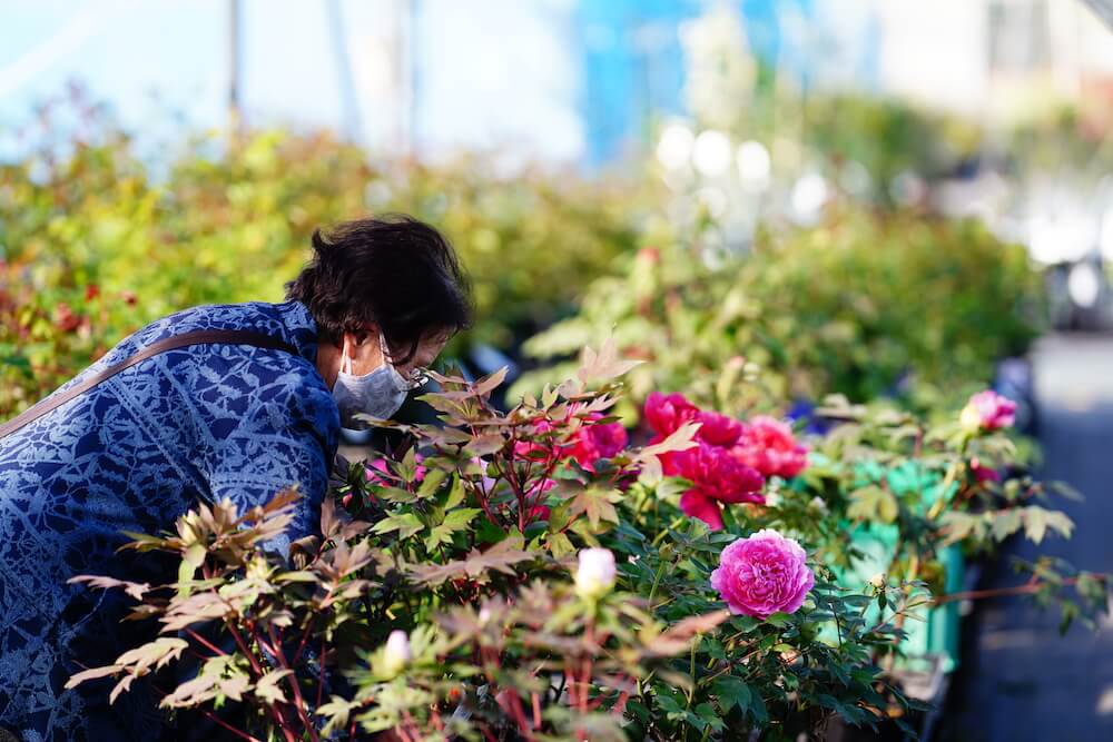 真剣に牡丹の苗を選ぶ店長の祖母(96歳)。
