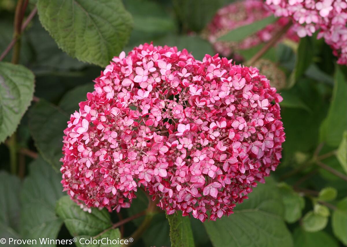 アナベル「ミディ ピンク」は花色の変化が美しいアナベルです。最初は鮮やかなピンク色、やがて柔らかなピンク色へ、咲き終わりにはグリーンへと変化します。ピンクのアナベルの改良品種で、花の色葉の色がより深く濃い色になり、繰り返し咲く性質がさらに強くなりました。