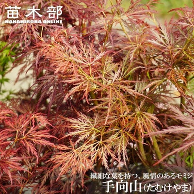 手向山(たむけやま)は紅枝垂れとしてよく植栽されているモミジです。とにかく葉の淵が細かく、いくつもある深い切れ込みはまるで繊細なレース飾りのよう。他のもみじとの違いは一目瞭然です。百人一首、菅家「菅原道真」の歌から名前を取ったもみじ、手向山(たむけやま)。