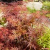 若葉の頃は繊細で落ち着いた色をしています。真夏には紫色に近い濃い緑色に変化し、そのまま秋を迎えて再び真っ赤に紅葉します。日本原産のヤマモミジの枝垂れ性品種の中の代表的な品種です。