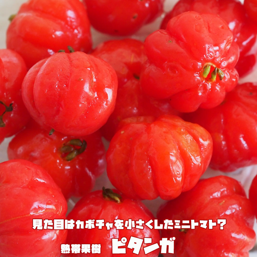 ピタンガは常緑性の熱帯果樹です。直径2.5cmくらいのやや扁平で独特な形の赤い実をつけ、春と秋(晩夏)の2回収穫できます。やわらかくジューシーな実は適度な甘みと酸味があり、さっぱりした風味はミニトマトにも似ているんだとか? 栽培はアセロラよりも簡単ですが、果実は果皮がうすく日持ちしないため、生で食べられるのは家庭栽培ならではの楽しみです。ジャムやゼリー、シャーベット、果実酒への加工にも適しています。ピタンガのラバーは大玉品種で果実重は約7~8gです。果皮は赤色,糖度は11~12度前後。