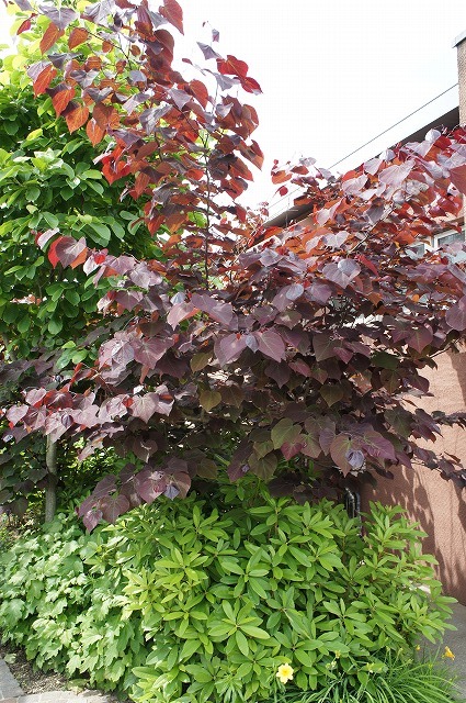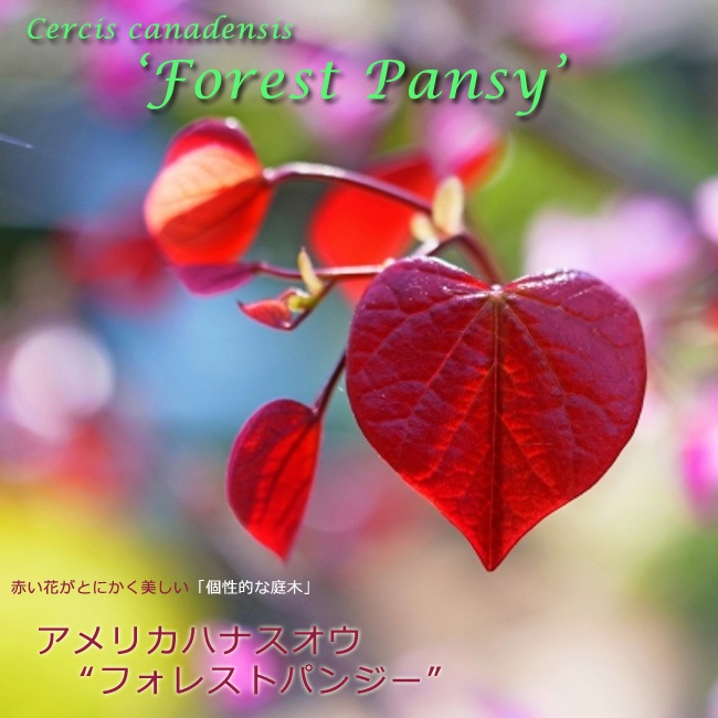 | ●品種の特徴 アメリカハナスオウの園芸品種です。丈夫で樹勢が強い本は比較的育てやすいです。 本種の最大の特徴は何と言っても葉の形と色です。ハート型のかわいい葉、すばらしい葉色のカラーリーフで見る人を魅了します。花の枝は生花の枝物にもよく利用されます。枝を埋め尽くすように小さなピンク色の花が咲きます。マメ科の落葉樹で、花後に「さやえんどう」のような実をつけます。 木は直立するので、狭いスペースでも植えれます。樹高は3m位まで生長します。 この業界に入った頃、一番ほしかった木がこの樹種です。当時は中々手に入らない珍しい樹種で高価でした。(店長の思い出) | 学名 | Cercis canadensis ‘Forest Pansy’ アメリカハナズオウ マメ科ハナズオウ属 | 原産地 | アメリカ | | 最終樹高 | 最終葉張り | 成長の早さ | 日照条件 | 開花期 | 類似品種 | 植栽適地 | | 耐寒性 落葉小高木 2~3m | 3~4m | 普通 (0.3m/年) | 日向~半日陰 | 4月 | | 西北海道~沖縄 | ※苗木は全て国産苗木です。 ※本などでは5mくらいに育つと記述もありますが、庭植えではせいぜい3mくらいです。 | 魅力 | | | 育てやすさ | 初心者におすすめ: 耐寒性中、耐暑性強、耐病性強、害虫がつきにくい、樹勢強、耐陰性あり | | 用途 | シンボルツリー、鉢植え、盆栽、ボーダー、寄せ植え、目隠し、花壇、工場緑地帯、街路樹、学校、公園、ゴルフ場 | 肥料や剪定など、詳しい育て方のコツはページ最下部をご覧ください。 ※本種は生育環境や植栽地域によって大きさや、性質が多少変化しますのであくまで目安です。肥料や剪定など、詳しい育て方のコツはページ最下部をご覧ください。 ※本種の移植や植え付けは11月~梅雨入り頃までに行ってください。 |