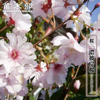 彼岸桜の色の濃いもの濃彼岸桜(こうひがんざく)です。。高遠の小彼岸桜の別称も「濃彼岸桜」ではあるものの、こちらの花は弁数が多いので違うものです(高遠の小彼岸桜は5弁花です)。弁数は小彼岸桜よりも多いが一応は一重咲き。名前どおりに春の彼岸くらいに開花。 記念樹や、シンボルツリーとして最適です。