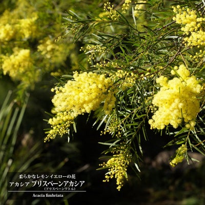 ブリズベーンアカシアは、枝垂れる性質ではないものの、長く伸びた枝先に花をつけるため、全体にふんわりとした整った樹形に育ちます。オーストラリアのブリスベーンでよく見られる品種ですが、比較的高温多湿に強いため日本でも育てやすいアカシアです。