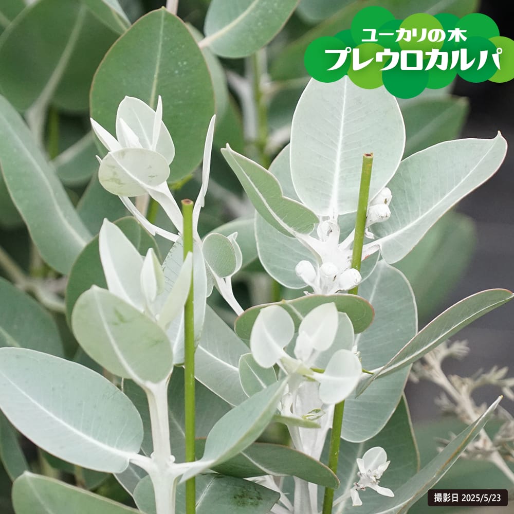 「プレウロカルパ」は大きな白銀色の葉と茎が美しいユーカリです。切枝用として大変人気の高い品種で茎はその断面が尖った四角形のユニークな形をしています。葉の縁には固めの白い毛のようなものが生えており独特の雰囲気を持っています。葉はこすると独特の芳香があります。根腐れを起こしやすい品種なので、水やりに注意が必要です。