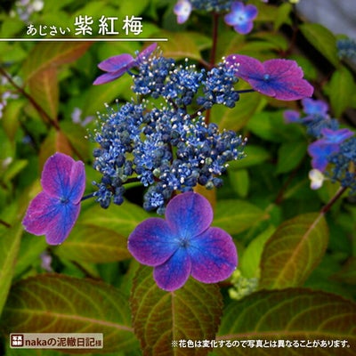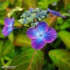 紫紅梅(シコウバイ)は、一重咲き・ガクタイプのヤマアジサイです。装飾花のガク片は小ぶりで丸く可愛らしいのですが、濃い赤紫色で中央部に青色が入る虹系(複色花)なので目を惹きます。咲き進むと色が変化していくので、タイミングによっては、1つの株で色味の違う花が見られます。葉も小さく全体的に小ぶりの品種なので、場所を選ばず楽しめます。