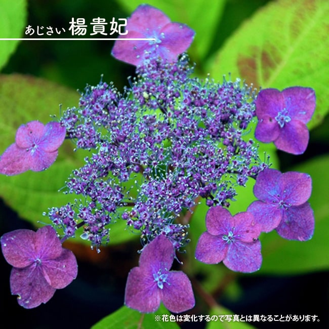 楊貴妃(ヨウキヒ)は、一重咲き・ガクタイプの山アジサイです。赤系の品種ですが虹系で、咲き始めは色が薄く、咲き進むと濃い赤紫色に変化していきます。青味の強い花が混ざることもある魅力的な花です。絶世の美女と言われた楊貴妃。その名に名劣りしない素敵なアジサイです。