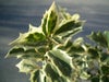 シマヒイラギは鬼柊(オニヒイラギ)の斑入り種のようなな感じで、オニヒイラギと同じような形や大きさの葉を持ちます。覆輪の斑入り葉で、イングリッシュホーリーにも似ています。芽吹き時はピンクがかります。常緑で年中変わらず美しい葉色です。洋風によく合う、明るい生垣に向きます。モクセイの仲間で、秋に小さなクリーム色がかった白い花が咲きますが、斑入りの白のおかげで花は目立ちません。葉色が美しいのでお許しください。葉は硬く直射日光に強いですが、斑入り葉なので葉焼けすることがあります。秋~冬は古くなった枝先の葉が寒さや葉焼けで傷んでシミが出たりします。