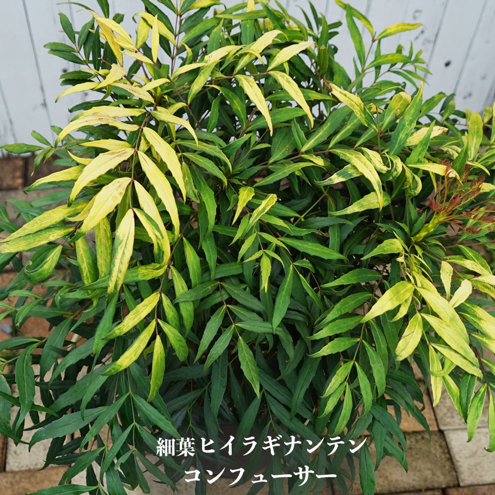 ヒイラギナンテン(柊南天)に似ていますが、花の時期は初秋です。黄色く小さい花がたくさん咲きます。葉はヒイラギのように先が尖っていますがそれほど鋭くなく、細い葉をつけます。花後に青紫の果実がなります。ヒイラギナンテンは冬に紅葉しますが、コンフューサーは年中濃い緑の葉が魅力です。葉っぱは幅が狭く細長いので、繊細でやわらかい優しい印象です。春の新緑は明るくなります。