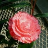 紅色の吹かけ絞りに白斑が入る賑やかな模様の椿